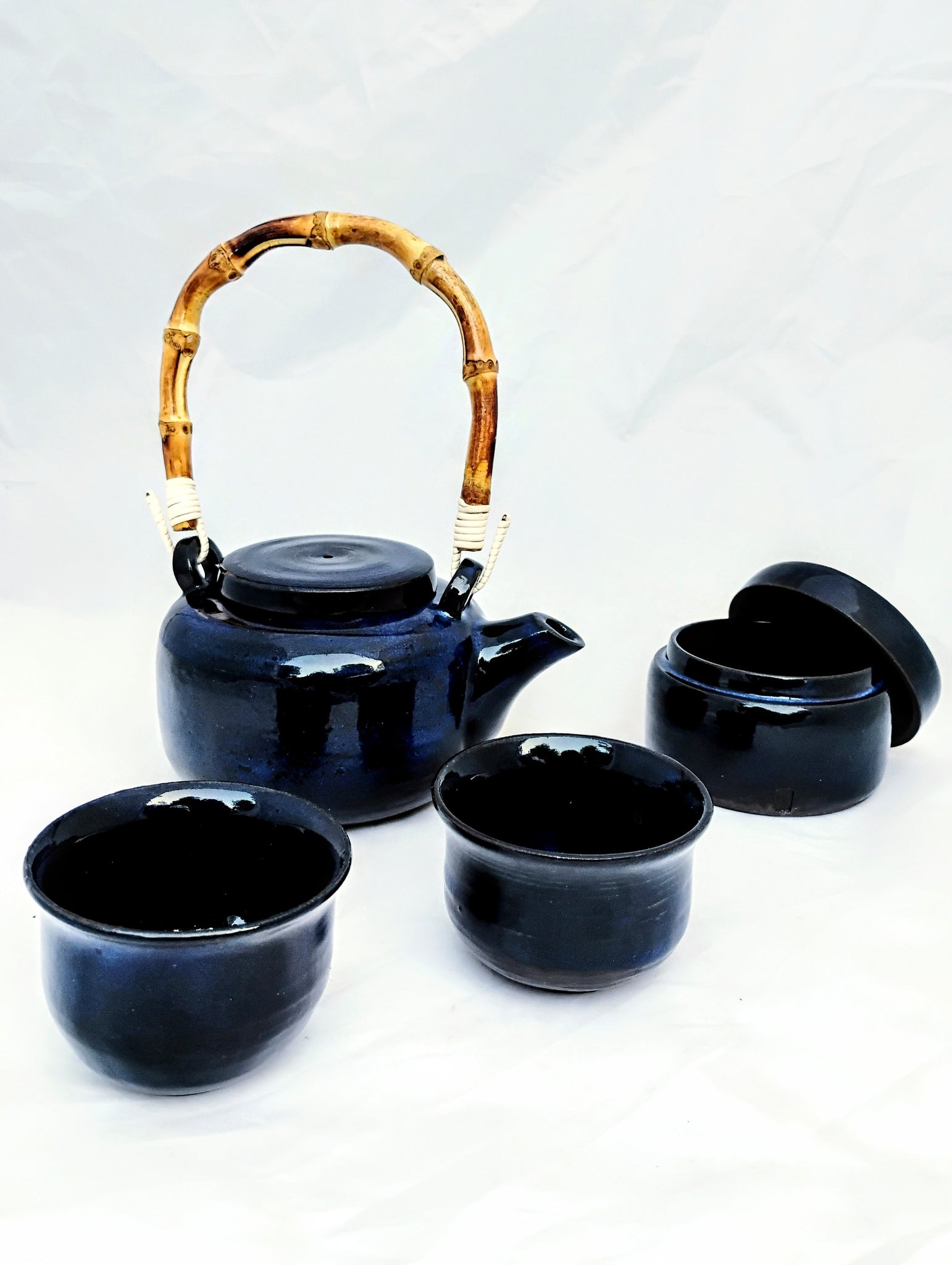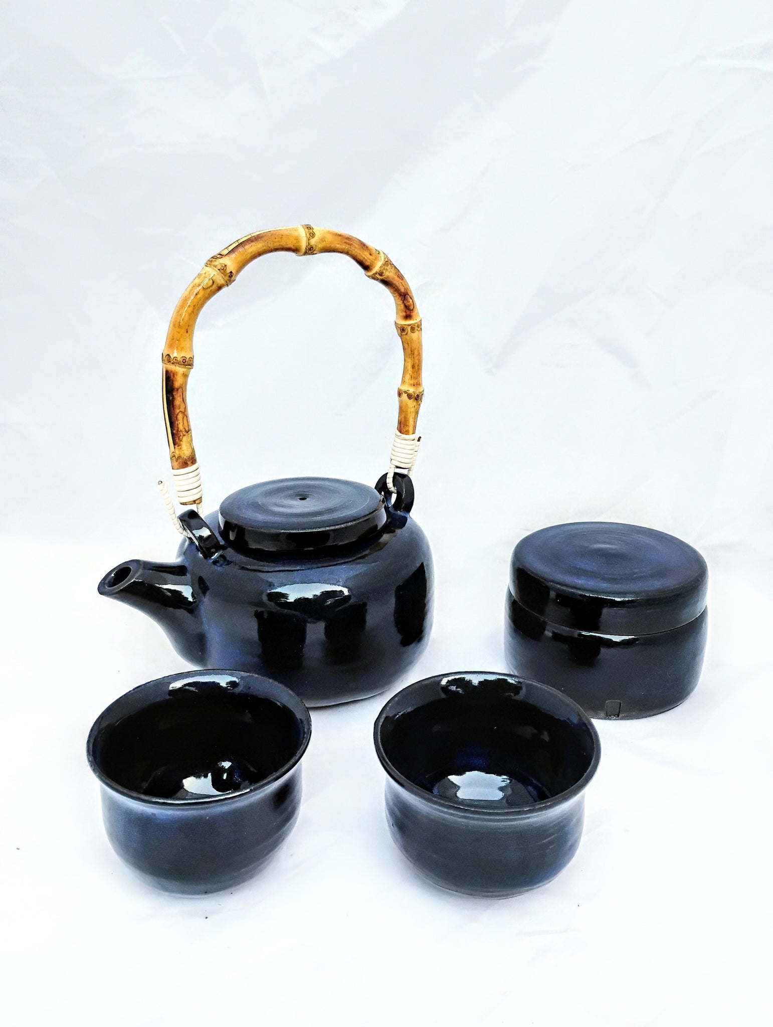 This set has a deep black, sumi ink appearance with  cosmic blue undertones. A perfect aid to your meditation or vibe session with a friend. Comes with One pot, two cups. Storage jar sold separately.